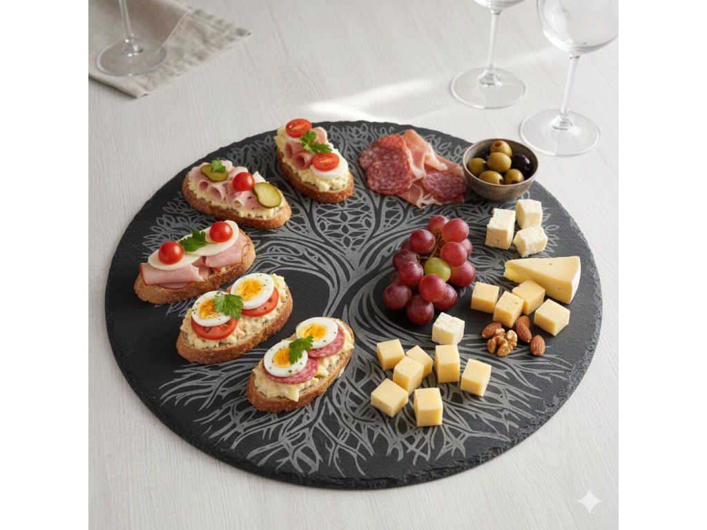 Břidlicový servírovací talíř „Strom života“ vyniká spojení přírodního materiálu, precizního gravírování a praktického využití. Talíř o průměru 30 cm je ideální pro servírování chlebíčků, cukroví, dezertů, sýrů, uzenin nebo drobného občerstvení při rodinných oslavách, návštěvách i slavnostních příležitostech.