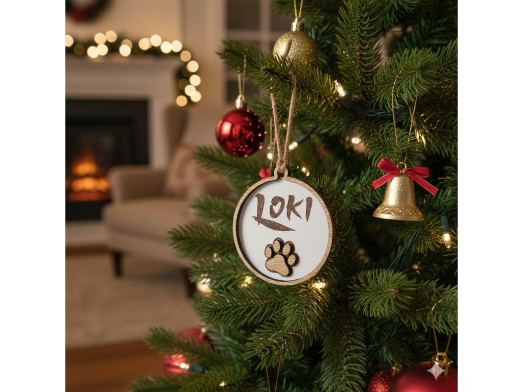 Místo jména "LOKI" můžeme vygravírovat jakékoli jméno podle vašeho přání, a roztomilá tlapka zůstane zachována. Jméno a tlapka jsou pečlivě vygravírovány do horní vrstvy a vystupují nad spodní bílou plochou, čímž vytvářejí krásný kontrast a hmatatelný trojrozměrný dojem. Přírodní hnědá barva HDF desky a jutový provázek dodávají ozdobě rustikální a zároveň elegantní vzhled, který se dokonale hodí k jakémukoli vánočnímu stromku.