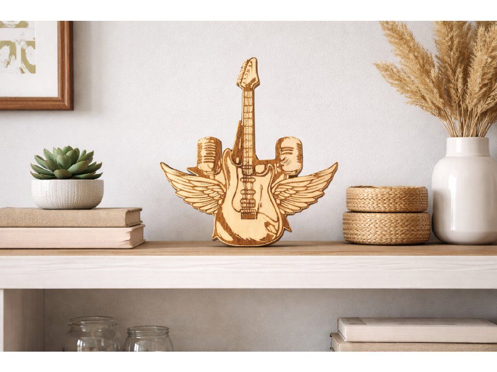 Originální dřevěná dekorace s motivem kytary a mikrofonu je ideální volbou pro všechny fanoušky hudby, koncertní atmosféry a stylového interiéru. Precizní zpracování z kombinace topolového dřeva a HDF zajišťuje lehkost, pevnost a čistý vzhled detailů.