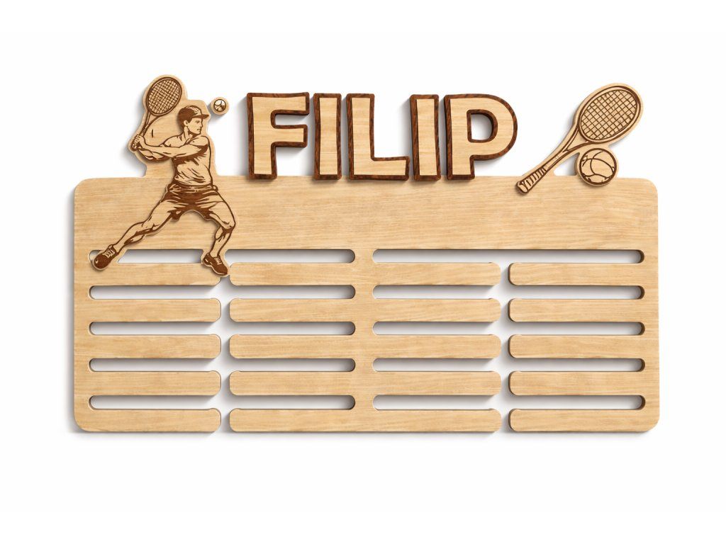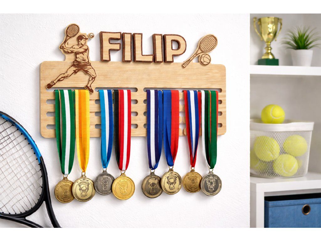 Originální dřevěný věšák na medaile s tenisovým motivem je ideální volbou pro všechny malé i velké tenisty, kteří si chtějí své sportovní úspěchy vystavit na viditelném místě. Každá medaile má svůj příběh – a tento věšák je skvělým způsobem, jak je uchovat přehledně a stylově.