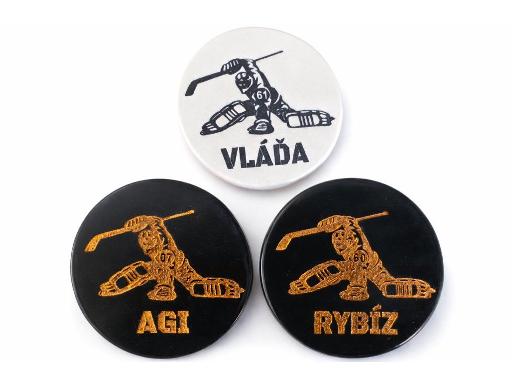 Hokejový puk s brankářem - vlastní jméno a číslo