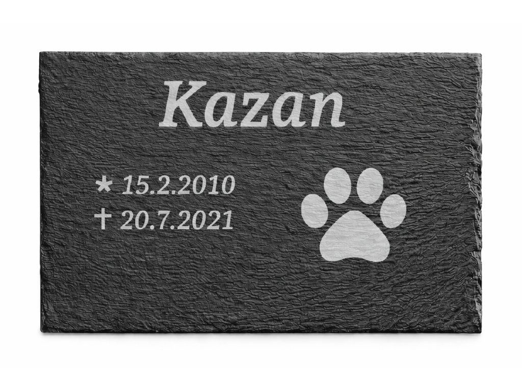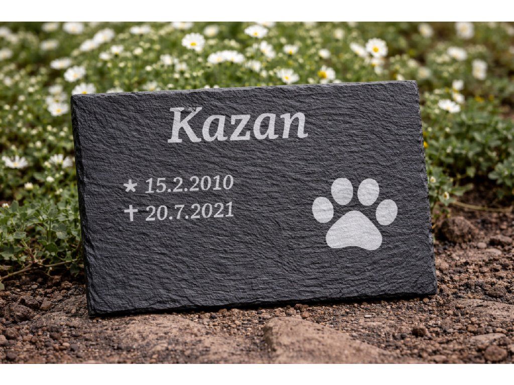 Náhrobek pro psa nebo kočku z přírodní břidlice je důstojným a nadčasovým způsobem, jak uchovat vzpomínku na vašeho věrného mazlíčka. Každý kus je vyroben z kvalitní přírodní břidlice o přibližném rozměru 30 × 20 cm, která je odolná vůči povětrnostním vlivům a díky své přirozené kresbě působí elegantně a přirozeně.
