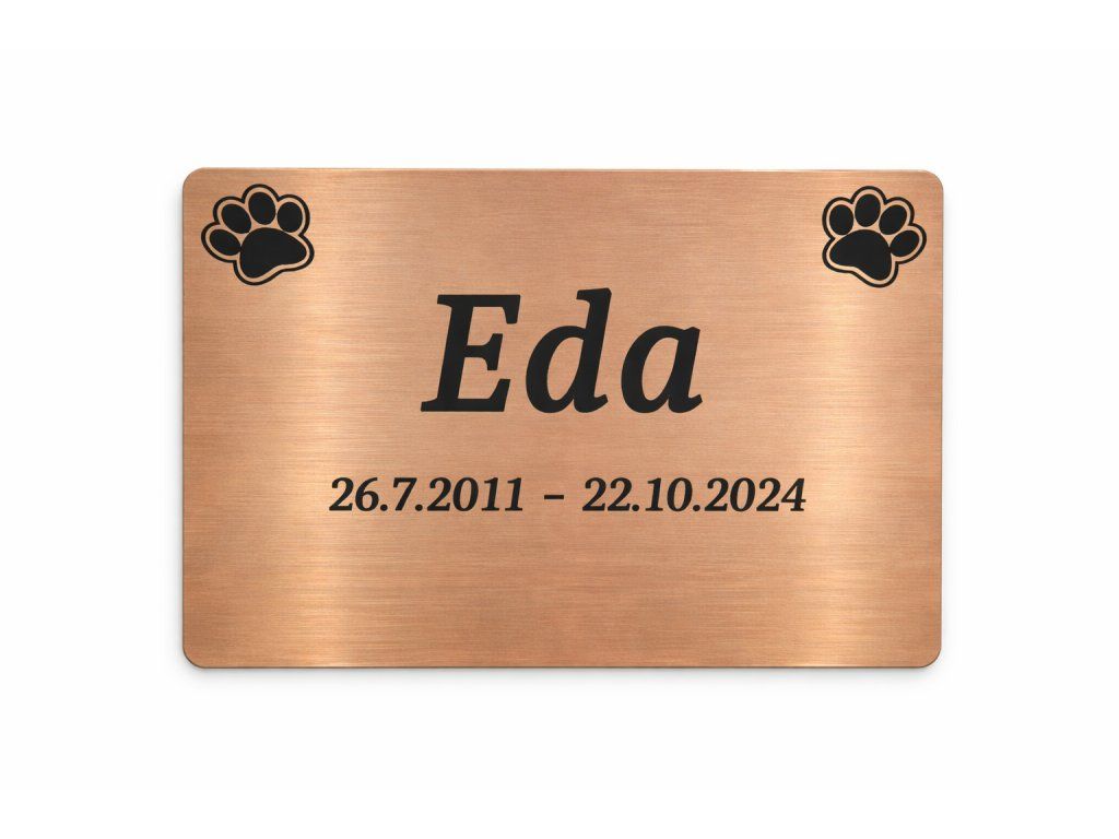 Každá pamětní deska je vyrobena na míru dle vašeho zadání – jméno mazlíčka, data narození a úmrtí a případně krátký text.