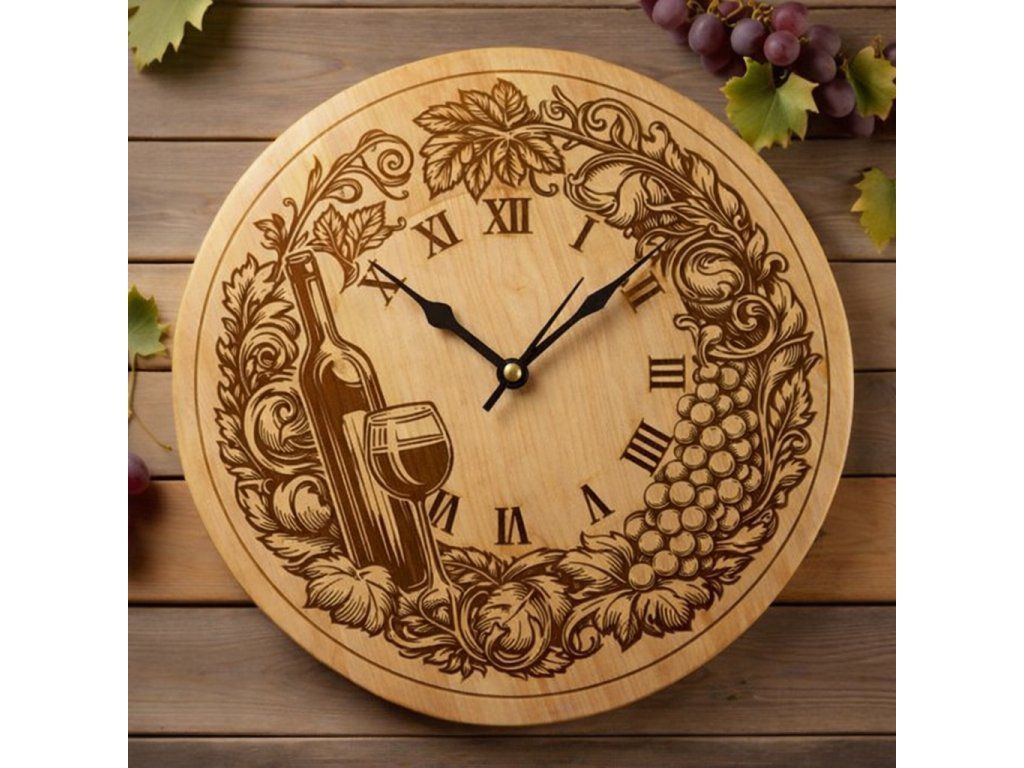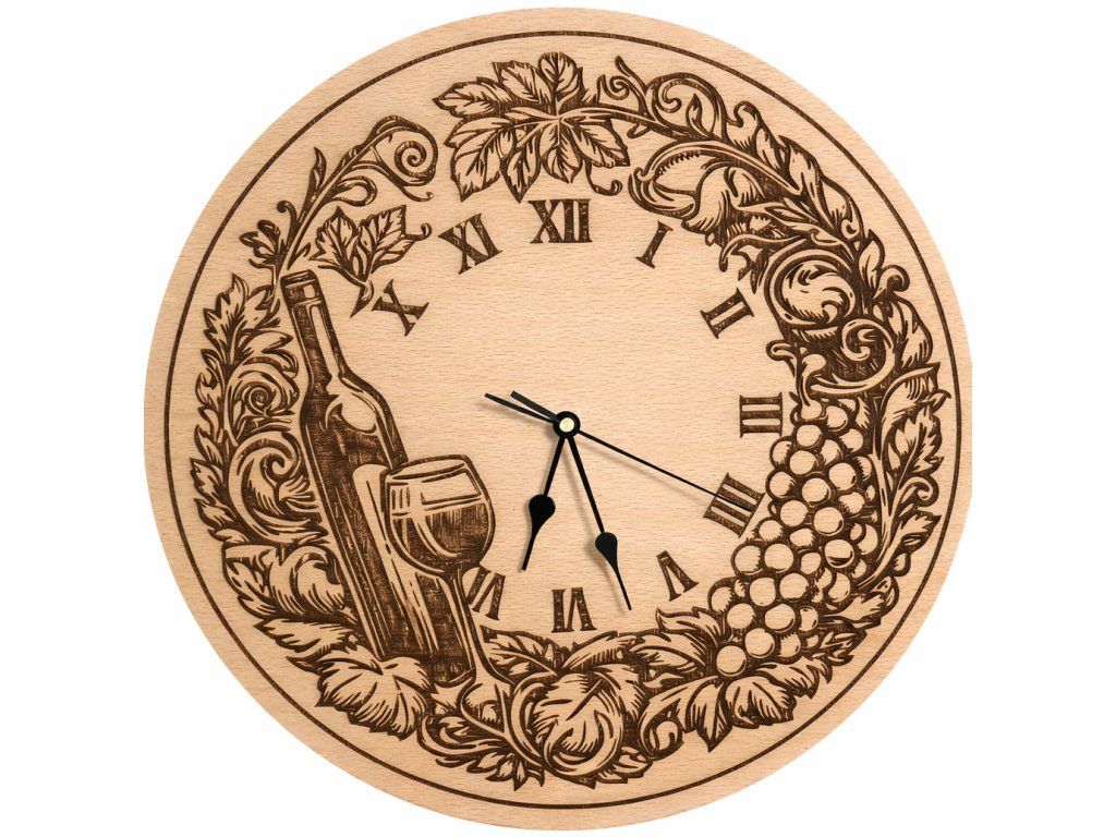 Hodiny jsou vyrobeny z kvalitního bukového dřeva o průměru 38 cm. Detailní motiv láhve, sklenice a vinné révy je precizně gravírován do masivu, což dodává hodinám přirozený a elegantní vzhled.