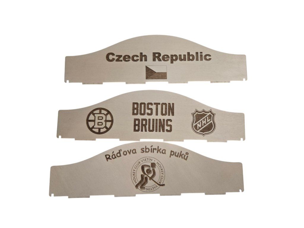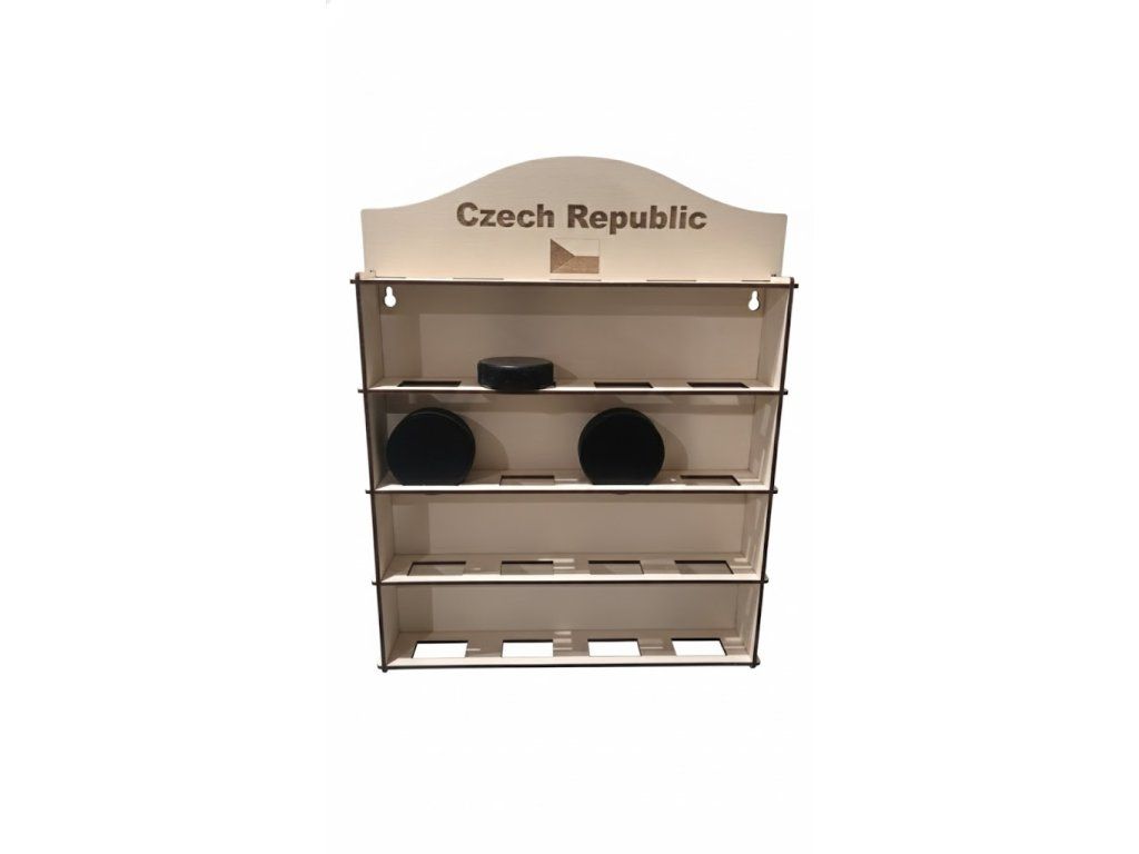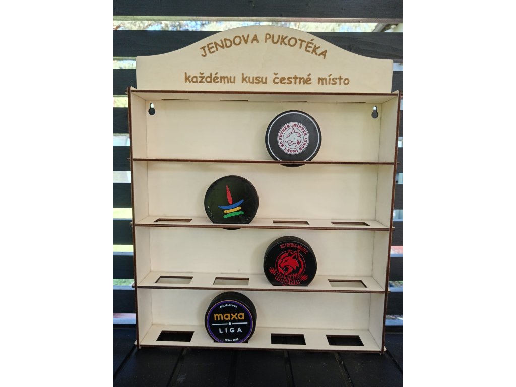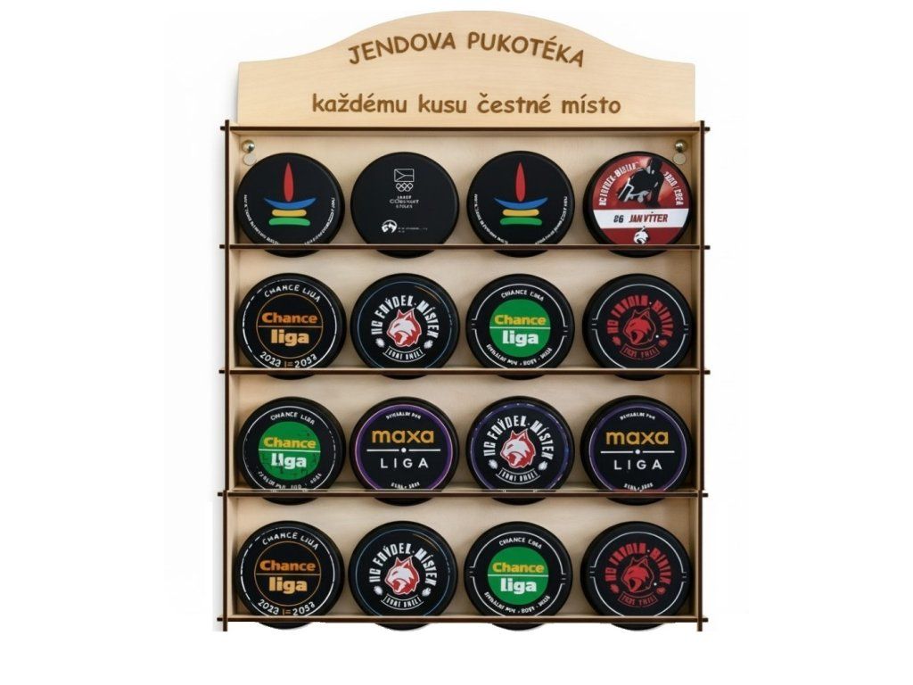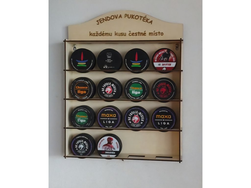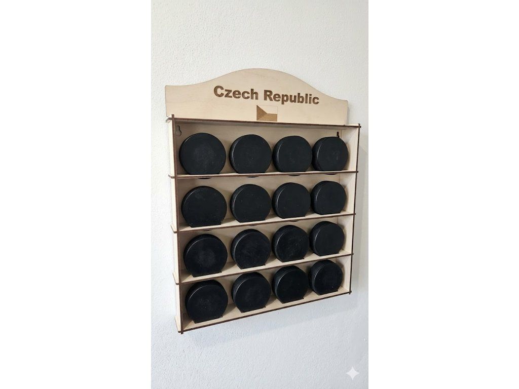 Dřevěný závěsný stojan na 16 puků – elegantní prezentace hokejových vzpomínek