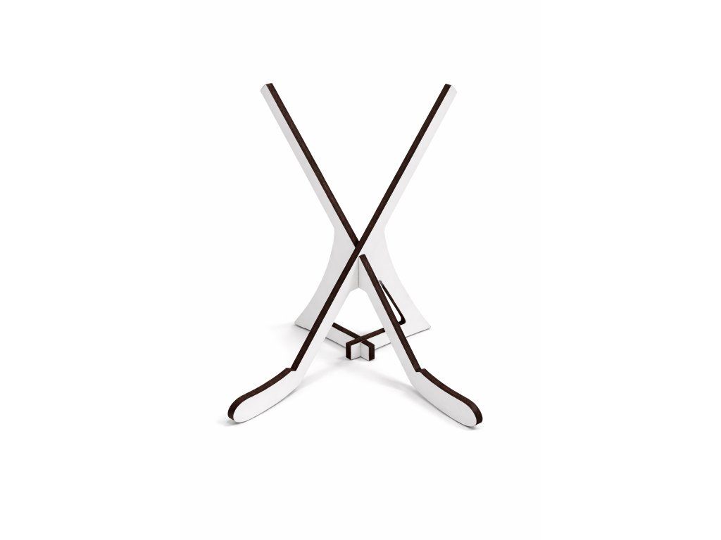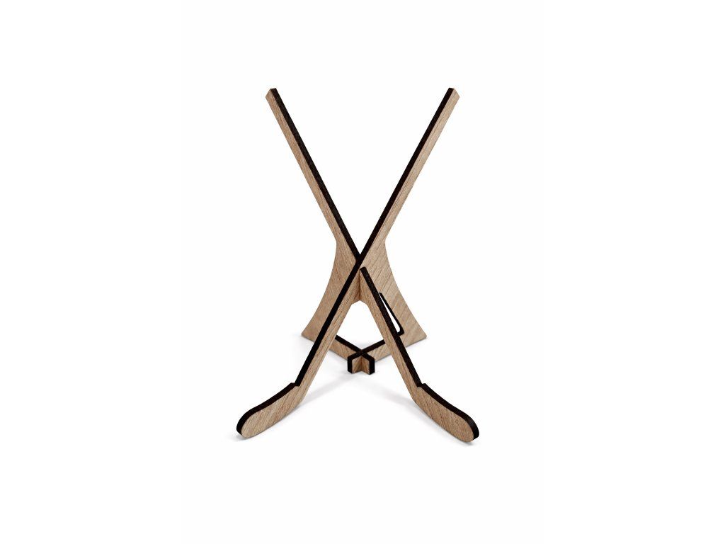 Minimalistická konstrukce ve tvaru kříže nechává vyniknout samotný puk, zatímco kontrast dřeva a tmavých hran působí moderně a luxusně.